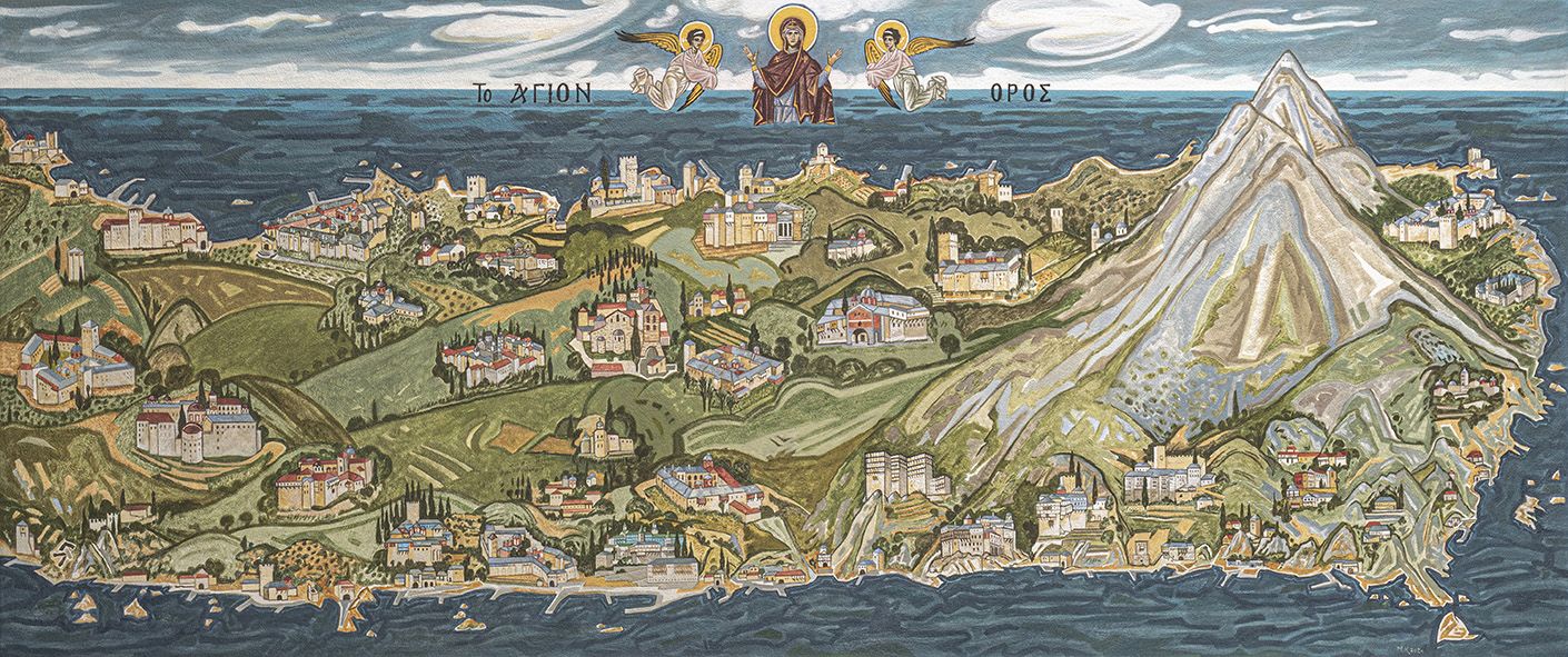 1. Παράσταση όλης της χερσονήσου του Αγίου όρους με τις μονές και τις σκήτες. 86x206 εκ.