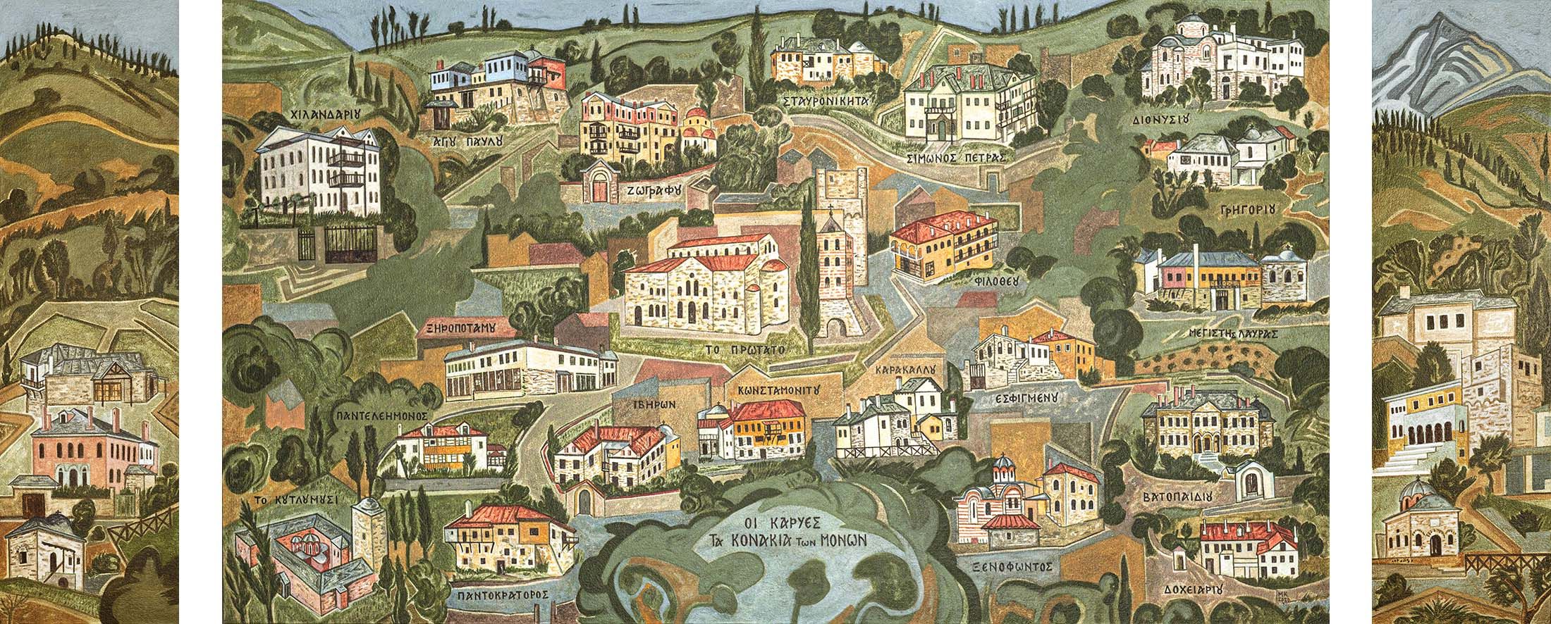 2. Τρίπτυχο των Καρυών, πρωτεύουσας του Αγίου Όρους όπου παρουσιάζονται μόνο τα κτίρια των αντιπροσωπείων των μονών, τα λεγόμενα κονάκια. 88x209 εκ.