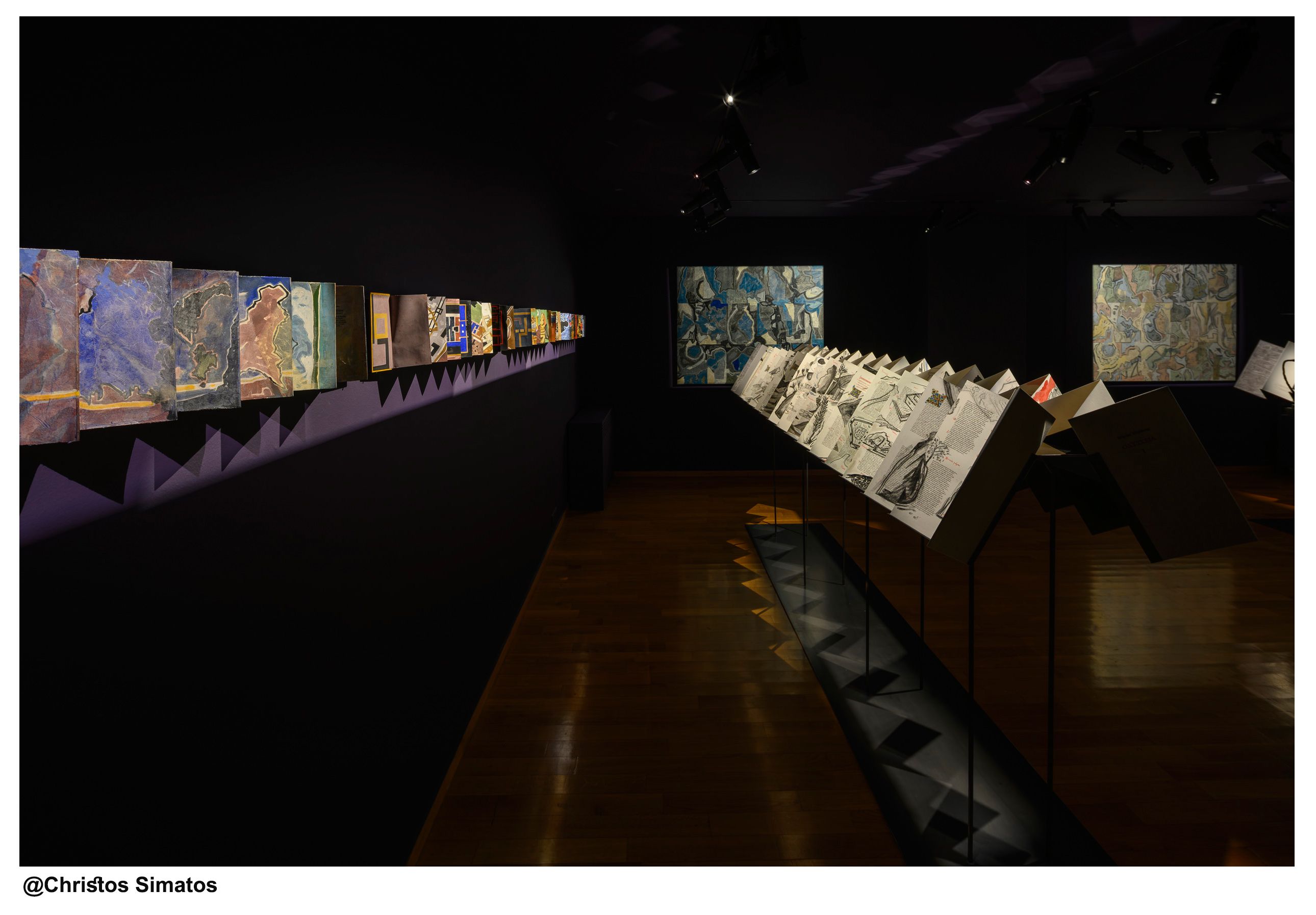 The central exhibit is a work in the form of a four-volume artists book created by M.K., who painted with charcoal and acrylic over a digital reproduction of the 15th-century manuscript Harley MS 6325, held by the British Library. Many of the works also take the form of painted books, each related to a specific narrative or rhapsody of the epic, while paintings based on real or imagined maps of the journeys of Odysseus and Telemachus complete the series.