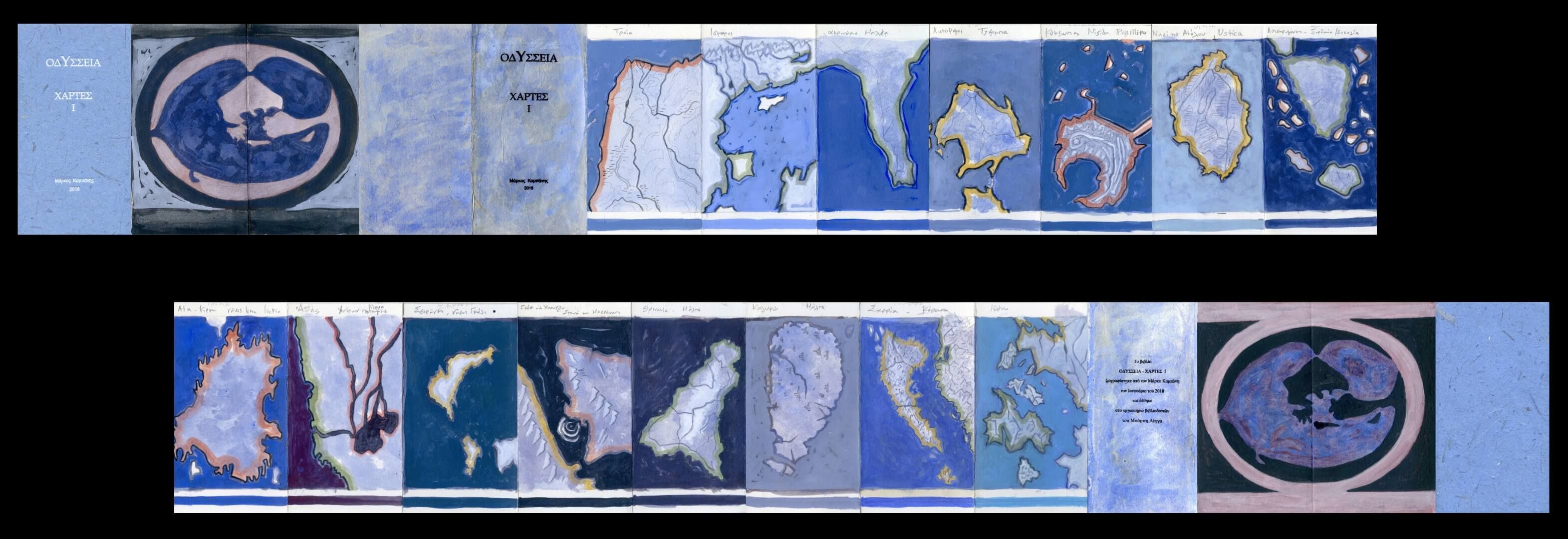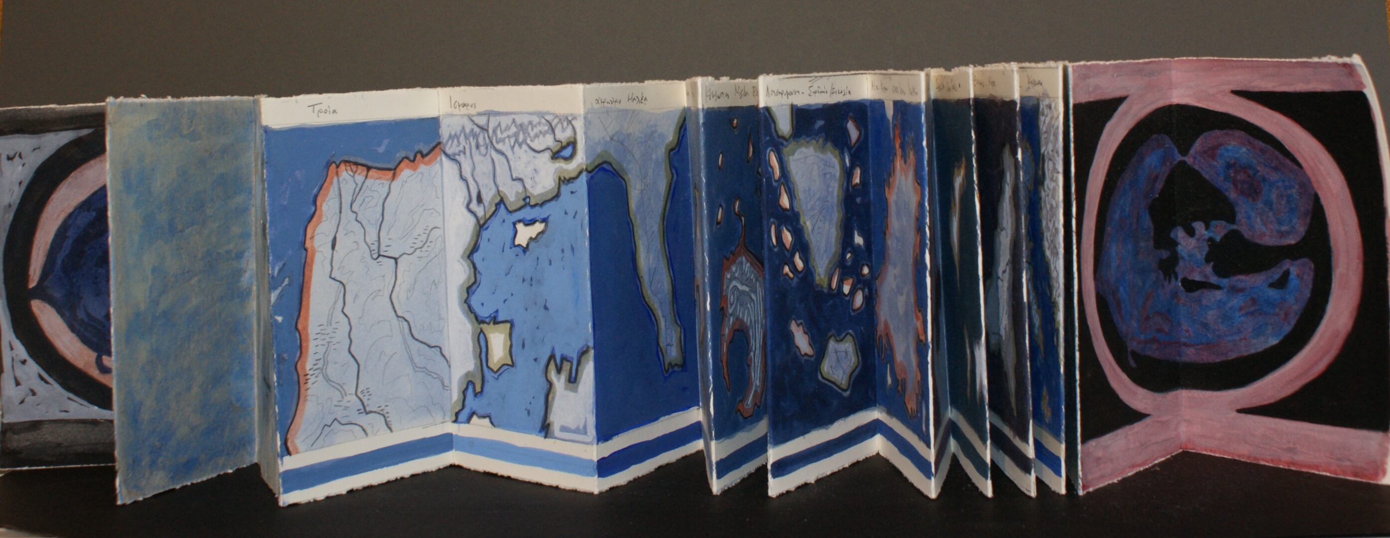 Odyssey- Maps I, 2018, a 22 page book painted with acrylic on Somerset paper. It is a part of a larger project underway concerning the Homer’s Odyssey.