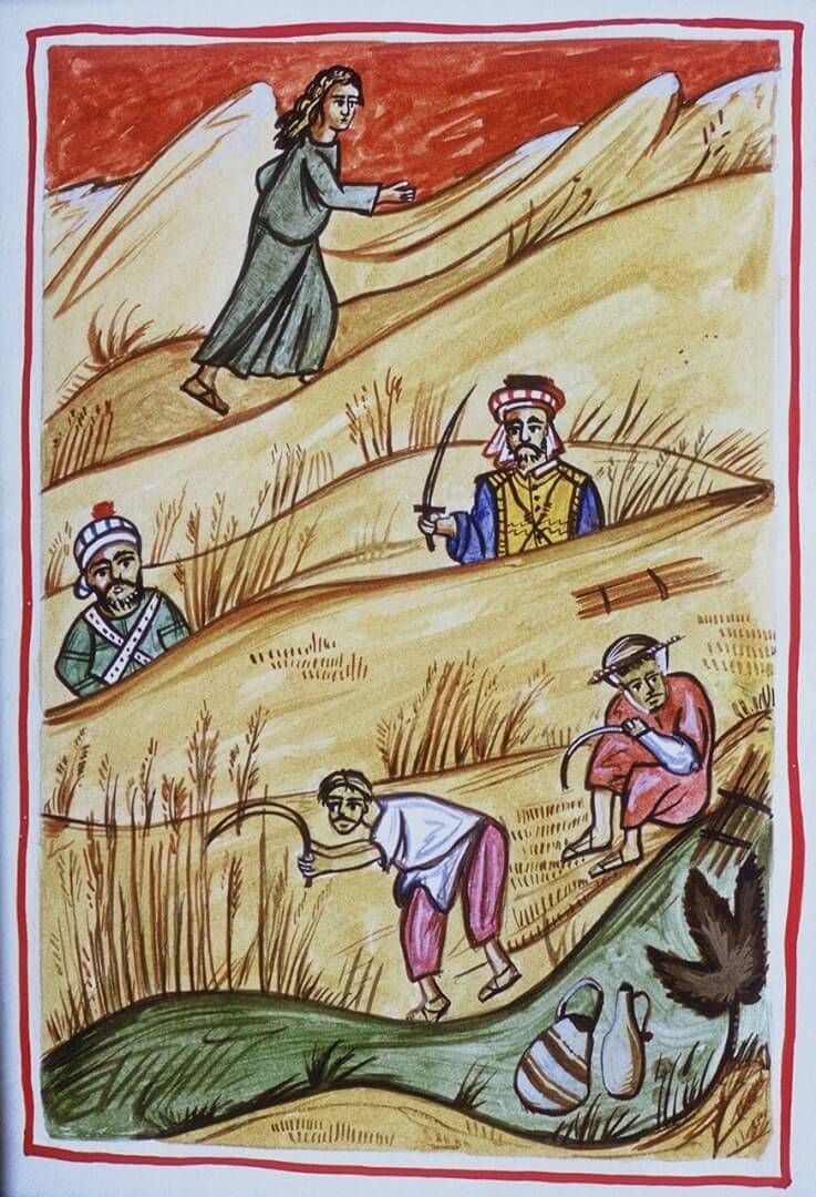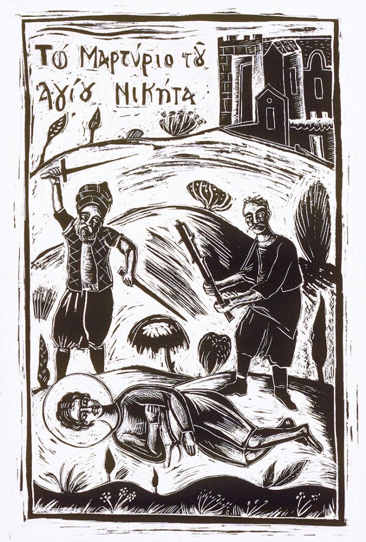 Παν.Σωτήρχου Οι Άγιοι Καβαλλάρηδες. Εκδόθηκε το 1995, η εικονογράφηση έγινε με ξυστά σχέδια με μελάνι σε χαρτόνι.