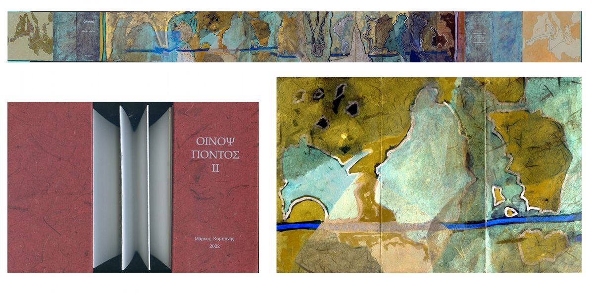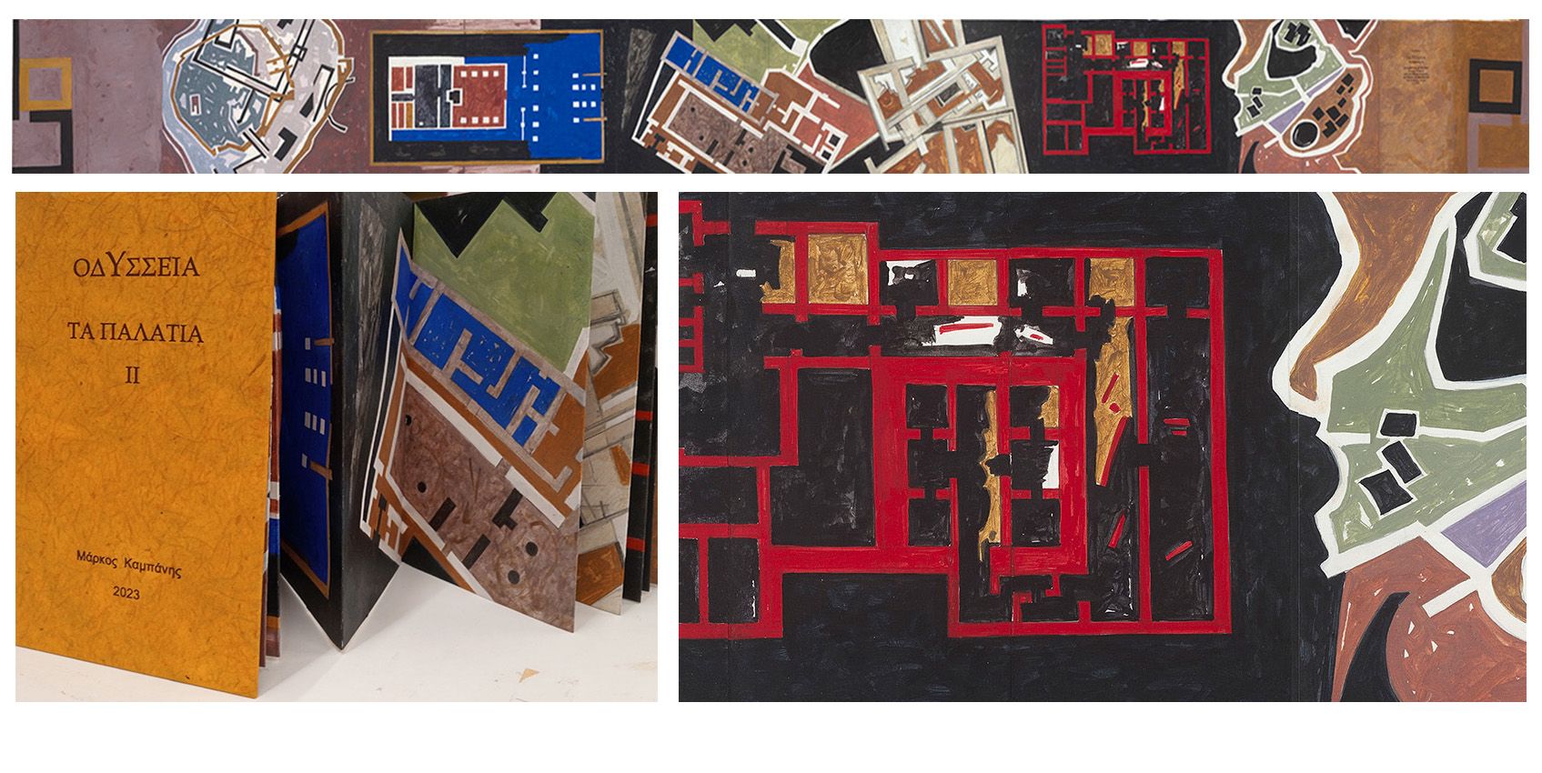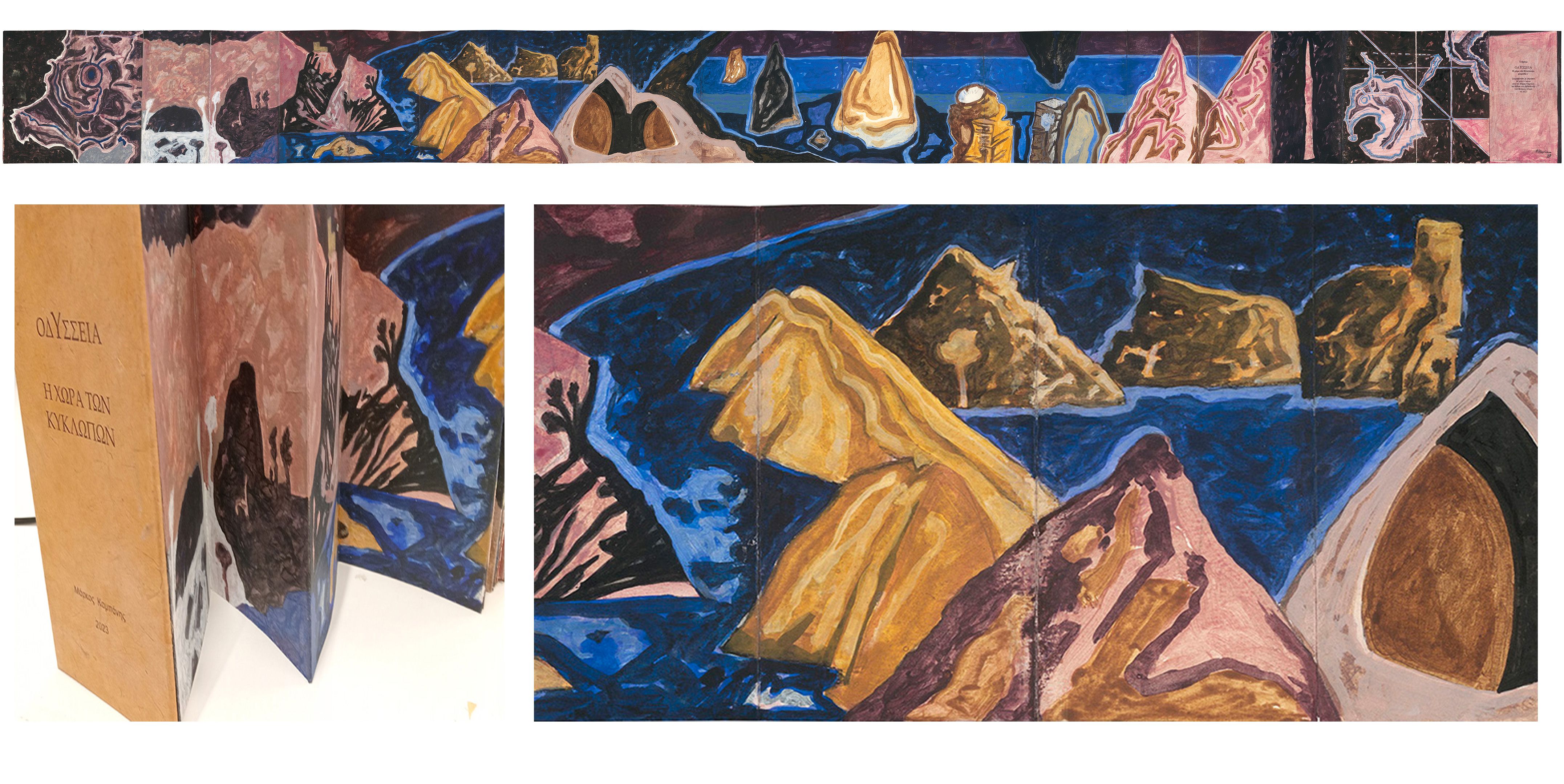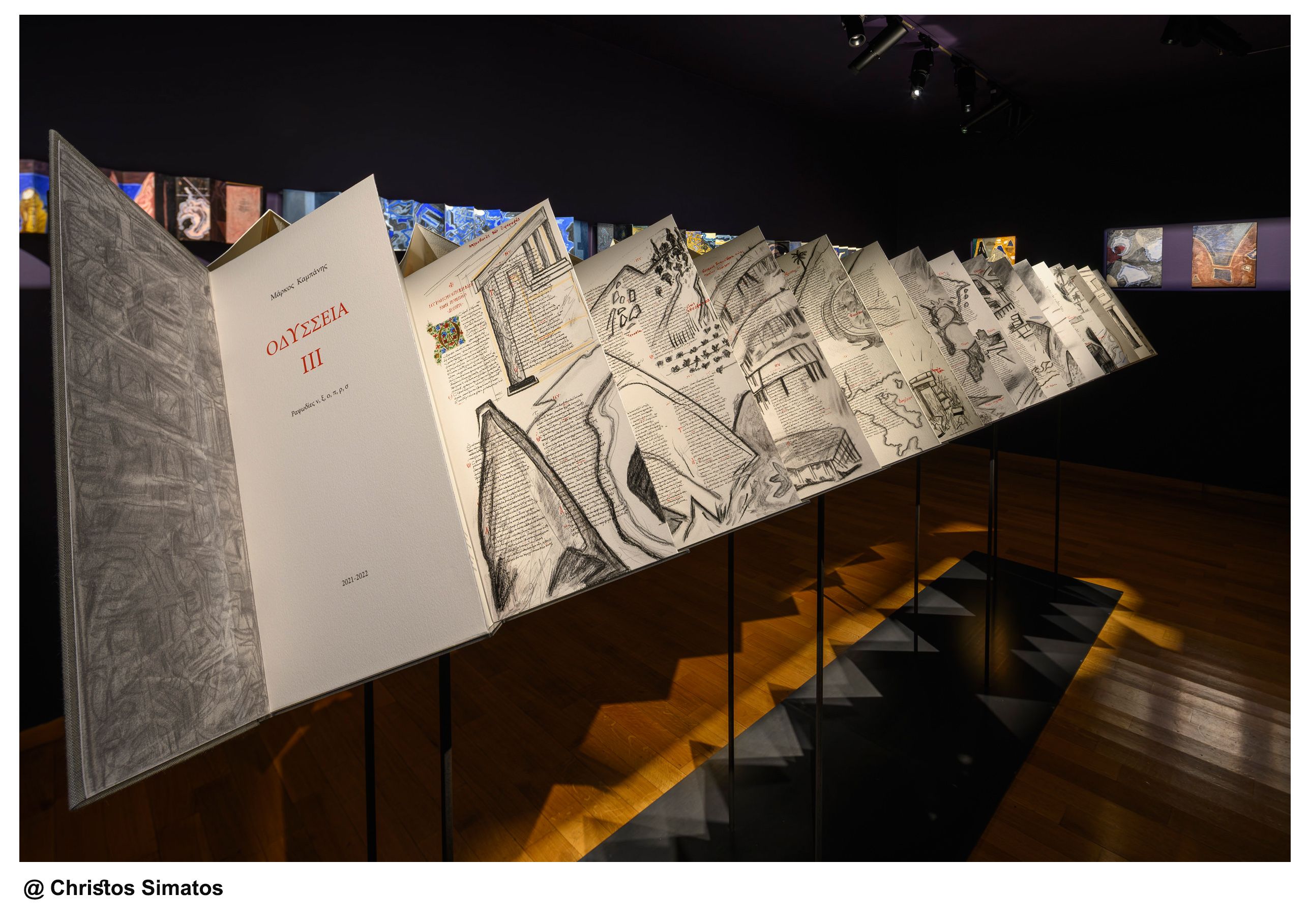 Το κεντρικό έκθεμα είναι ένα έργο - βιβλίο τεσσάρων τόμων που δημιούργησε ο Μ. Κ. ζωγραφίζοντας με κάρβουνο και ακρυλικό πάνω σε ψηφιακή ανατύπωση του χειρόγραφου Harley MS 6325 του 15ου αιώνα, το οποίο ανήκει στη Βρετανική Βιβλιοθήκη. Πολλά έργα είναι επίσης στη μορφή ζωγραφισμένου βιβλίου που κάθε ένα σχετίζεται με μια συγκεκριμένη αφήγηση ή ραψωδία του έπους. ενώ Ζωγραφική βασισμένη σε πραγματικούς ή επινοημένους χάρτες της πορείας του Οδυσσέα και του Τηλέμαχου συμπληρώνουν την σειρά των έργων.