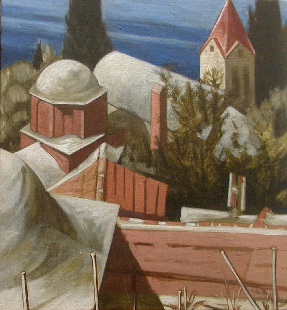 2.	Karyes triptych, 2020, acrylic on imitation mortar on wood, 88x209 cm. An abstracted view of the capital of Mount Athos presenting only the buildings housing the 20 monasteries delegations, the so called “konakia”