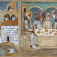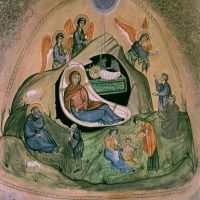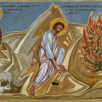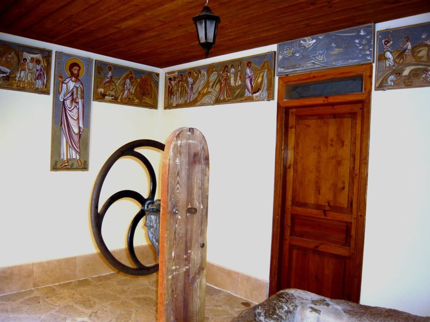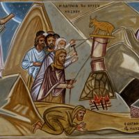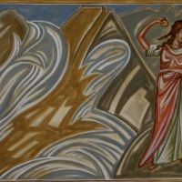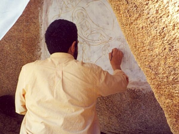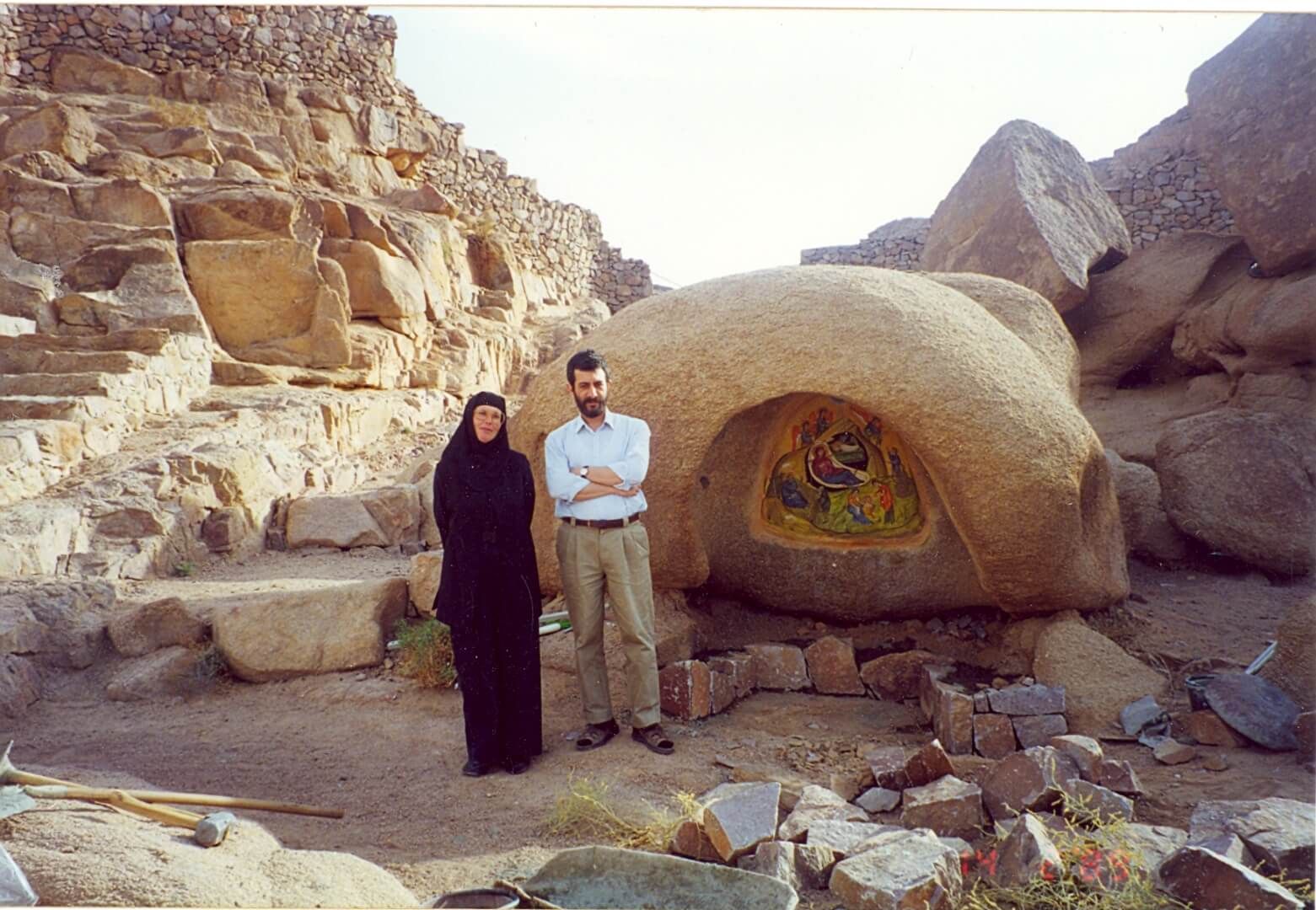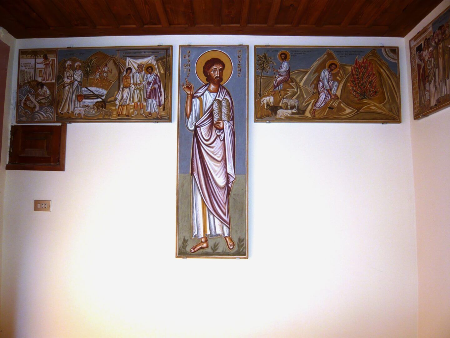 In the monastery on Mount Sinai Markos Kampanis has painted two murals. One is on a rock in the oasis of Tarfa, a true fresco mural of the Nativity, the other is a series of portable murals painted with casein and depict scenes from the life of Prophet Moses on Sinai (2007)