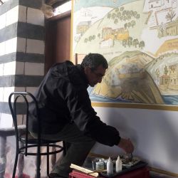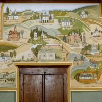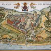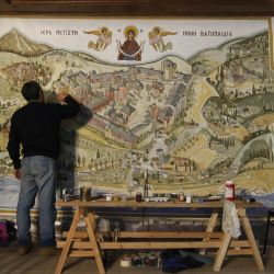Markos Kampanis has decorated the main entrance hall of Vatopaidi mponastery on Mount Athos (2013-2016). The murals depict all the compound of the monastery together with its dependencies and outside cells, present or historical on Athos itself and elsewhere.